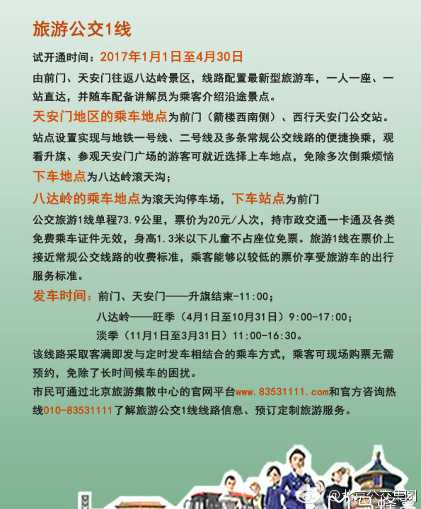 北京旅游公交1線行程安排(僅為行車路線,非經停站點),——全程不停車的。