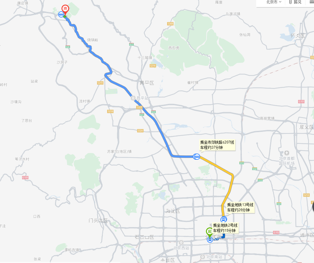 回程線路:八達嶺長城→京藏高速→德勝門→西二環→前門西大街→前門(行駛距離:約73.9公里,行駛時間:約100分鐘)。